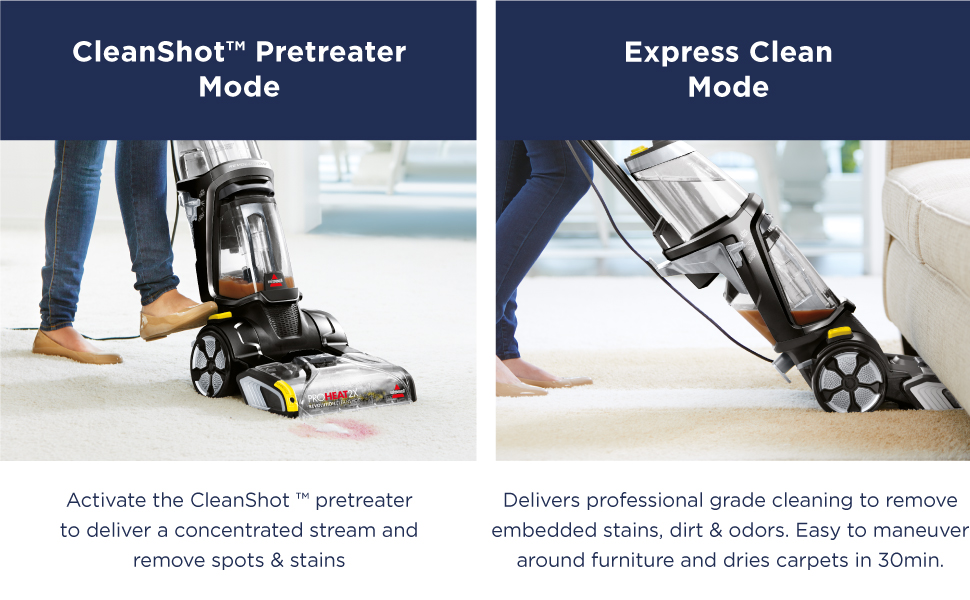 Max Clean & Express Mode: Packing in 12 rows of rotating Dual DirtLifter® PowerBrushes, it delivers professional grade cleaning to remove deep down embedded stains, dirt and odors. In Express Clean Mode, it delivers dry carpets in about 30 minutes.